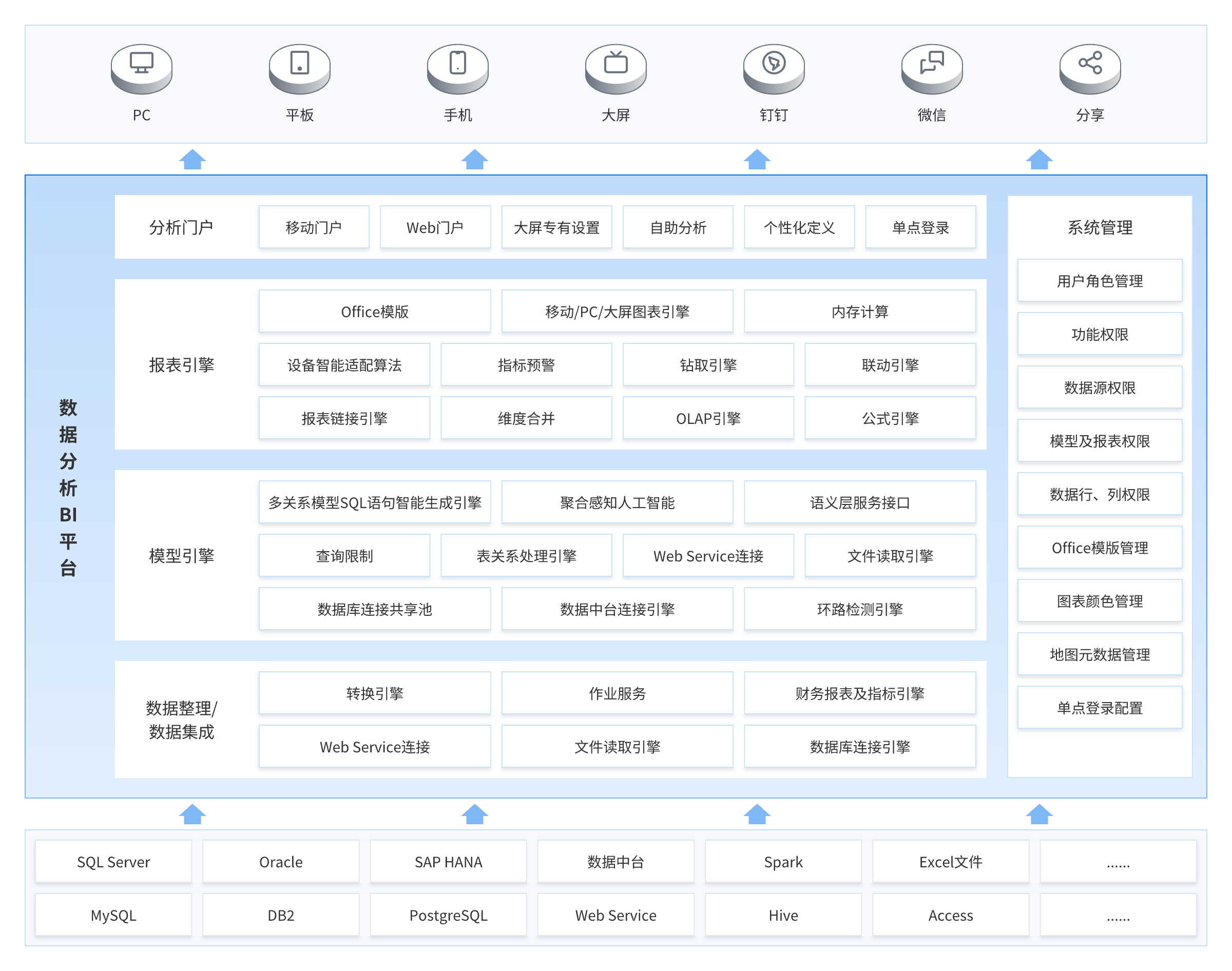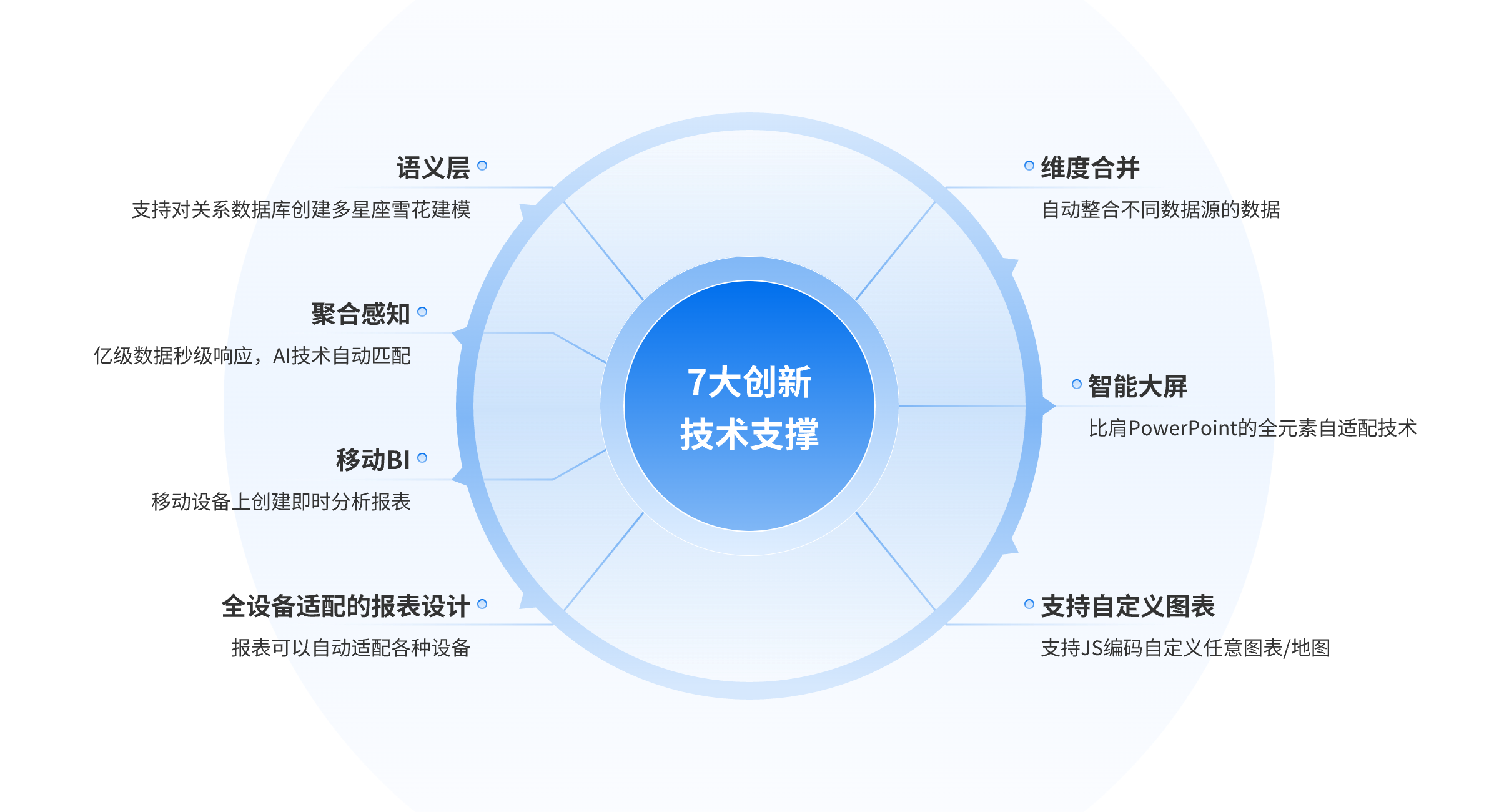BI產品綜合運用內存計算、云計算、邊緣計算及并發計算的領先技術,研發更智能的語義層核心技術以及H5渲染適配技術,真正實現讓企業組織實時使用BI數據分析,提升組織數據分析決策水平。