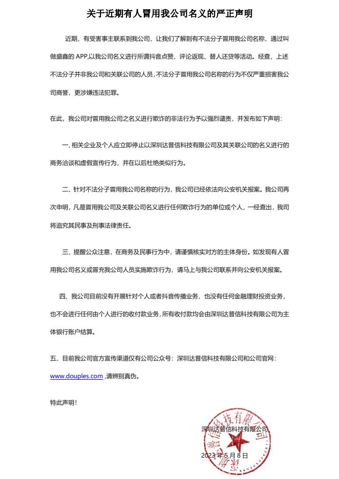 四、我公司目前沒有開展針對個人或者抖音傳播業務,也沒有任何金融理財投資業務,也不會進行任何由個人進行的收付款業務,所有收付款均會由深圳達普信科技有限公司為主體銀行賬戶結算。